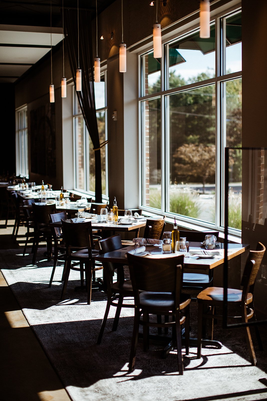Empty restaurant with large windows, wooden tables set with napkins, glasses, and bottles, and modern hanging lights, during daytime.